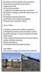 2Na sprzedaż 2 działki rolno ogrodowe. Miejscowość Ełk oś Bocianie gniazdo. Na działce 320mk. Stoi bardzo ładny ...